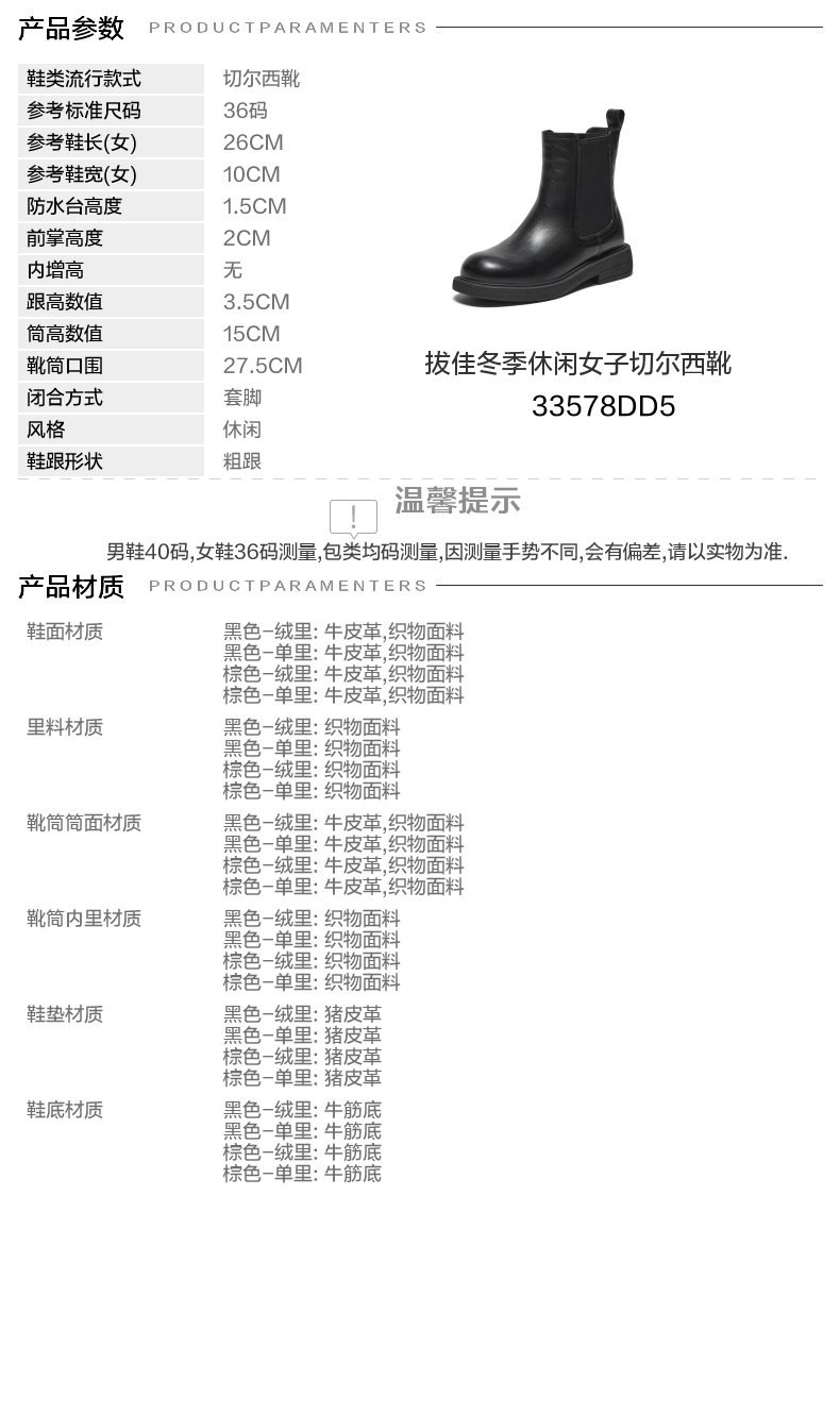 参考鞋宽(女):10CM 风格:休闲 色系:黑色 跟高数值:3.5CM 筒高数值:15CM