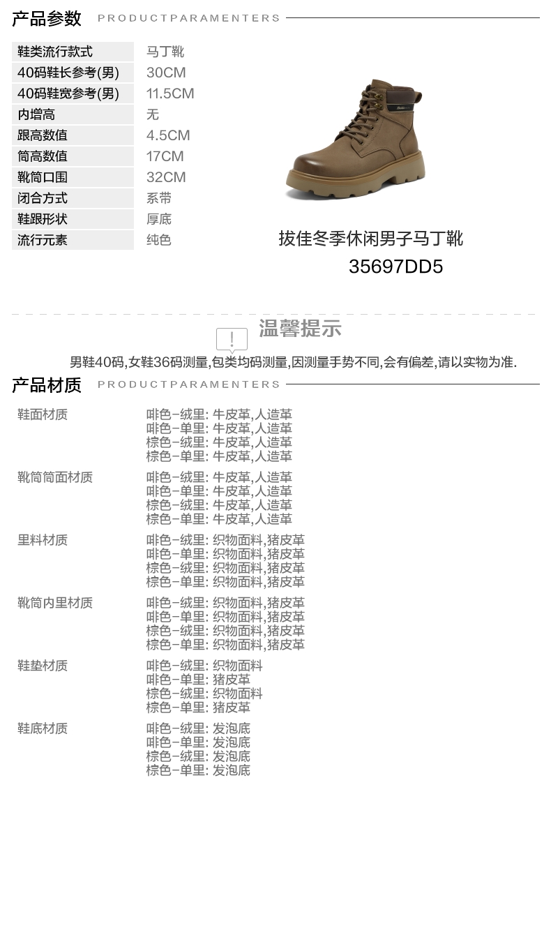 | 跟高数值:4.5CM | 色系:卡其 | 性别:男子 | 筒高数值:17CM | 靴筒筒面材质:人造革牛皮革 |