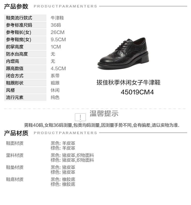 | 上市时间:2024年秋季 | 鞋类流行款式:牛津鞋 | 鞋头款式:圆头 | 跟高范围:中跟鞋(3-5CM) | 鞋面图案:纯色 |
