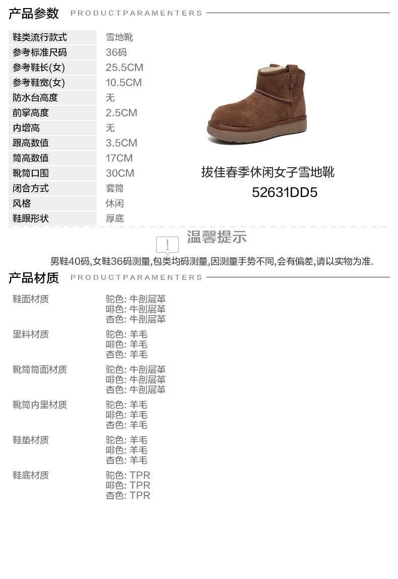 | 参考鞋宽(女):10.5CM | 风格:休闲 | 鞋面内里材质:羊毛 | 色系:咖啡色 | 跟高数值:3.5CM |