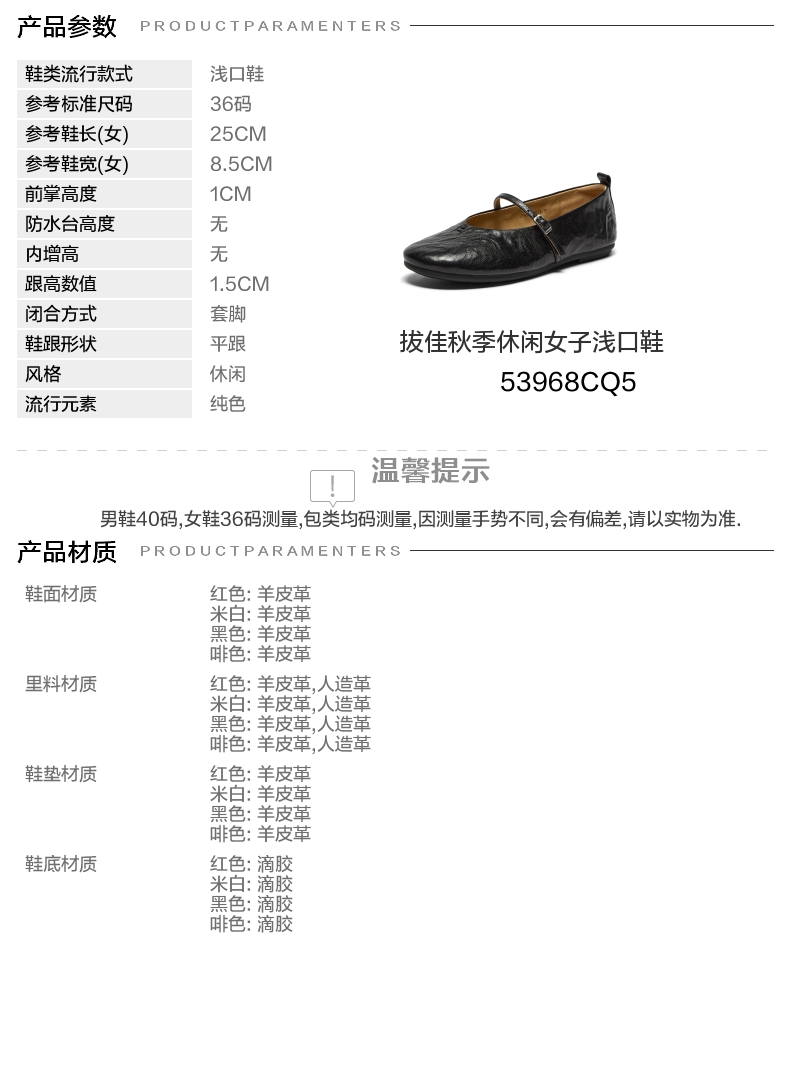 | 皮质特征:软面皮 | 前掌高度:1CM | 防水台高度:无 | 鞋类流行款式:浅口鞋 |