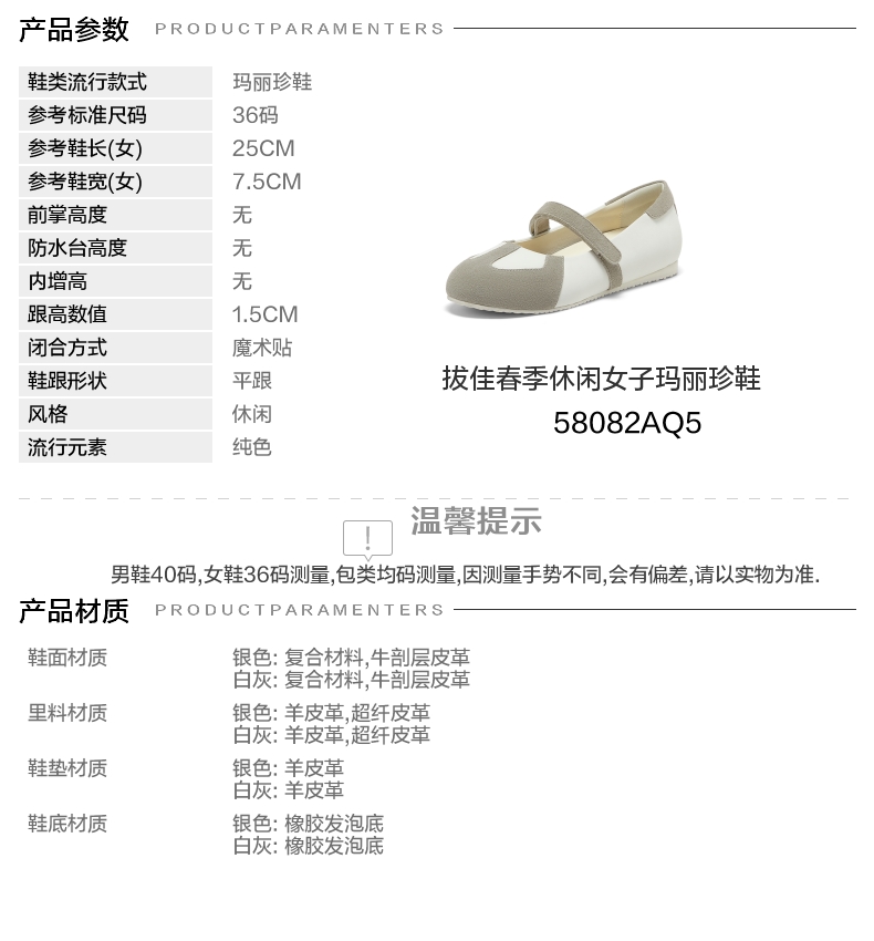 | 所在区域:电子商务 | 配跟:无 | 开口深度:浅口 | 风格分类:休闲玛丽珍 | 上市时间:2025年春季 |