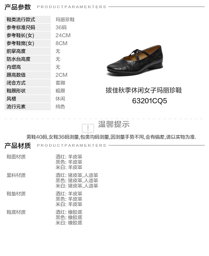 | 皮质特征:软面皮 | 前掌高度:无 | 防水台高度:无 | 鞋类流行款式:玛丽珍鞋 |