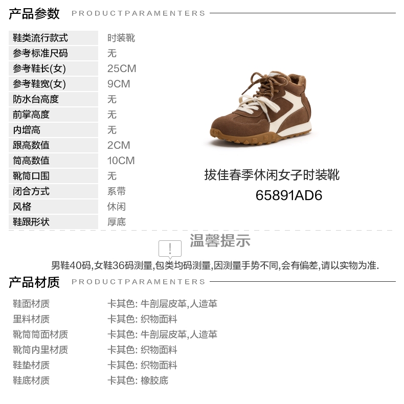 | 风格:休闲 | 鞋面内里材质:织物 | 色系:卡其 | 跟高数值:2CM | 筒高数值:10CM |