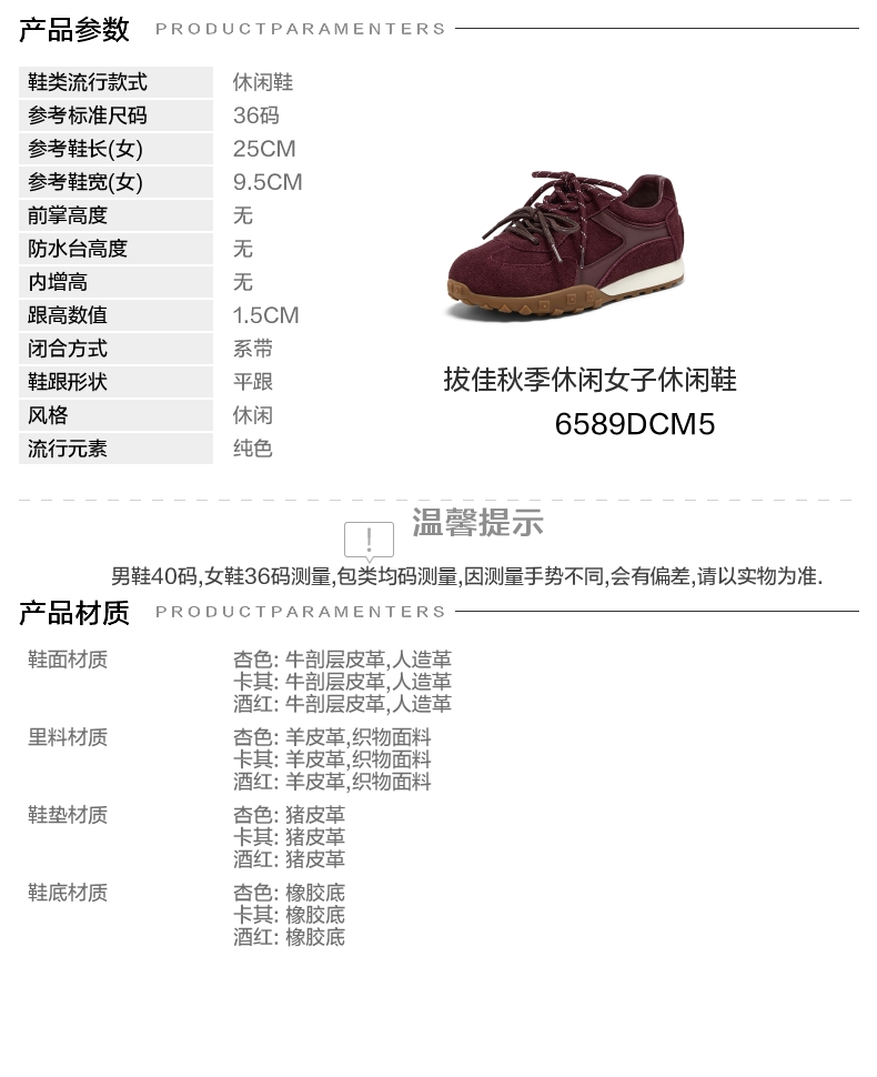 | 鞋帮:低帮 | 鞋底材质:橡胶底 | 内增高:无 | 鞋面材质:牛剖层皮革人造革 | 闭合方式:系带 |