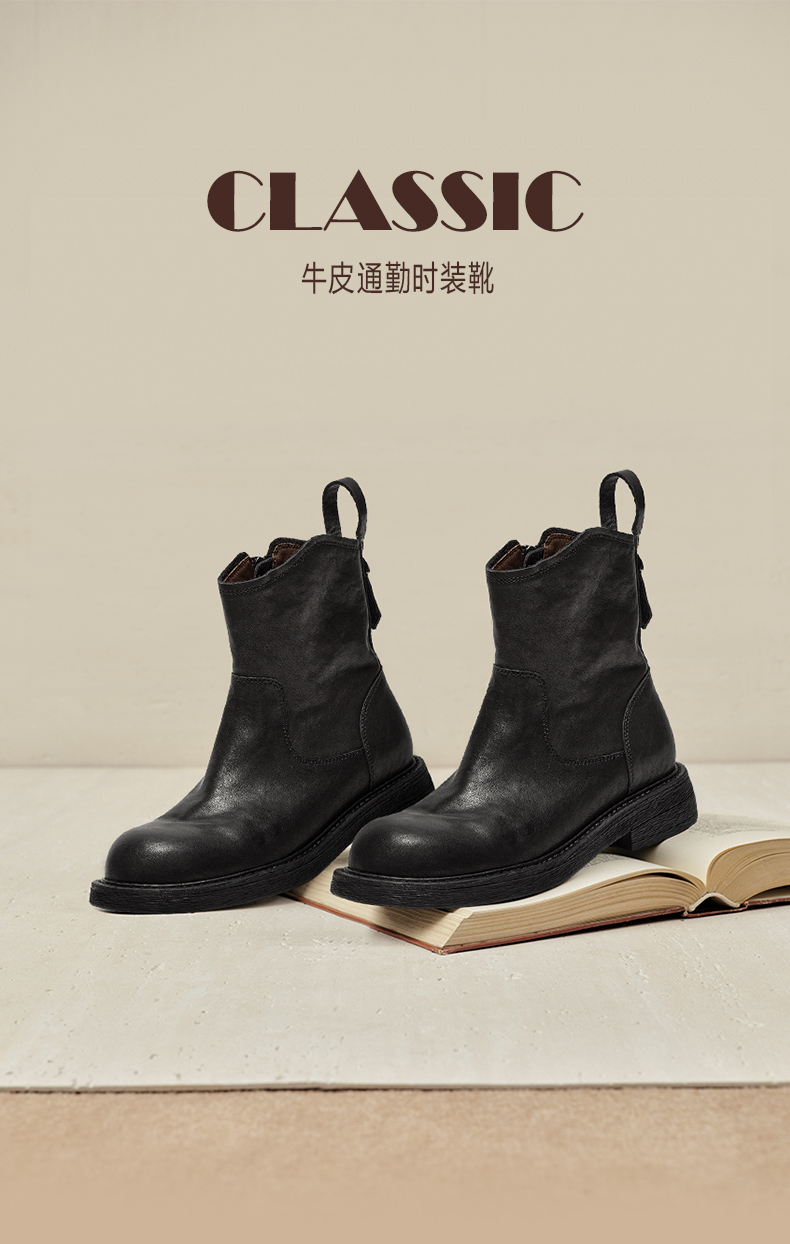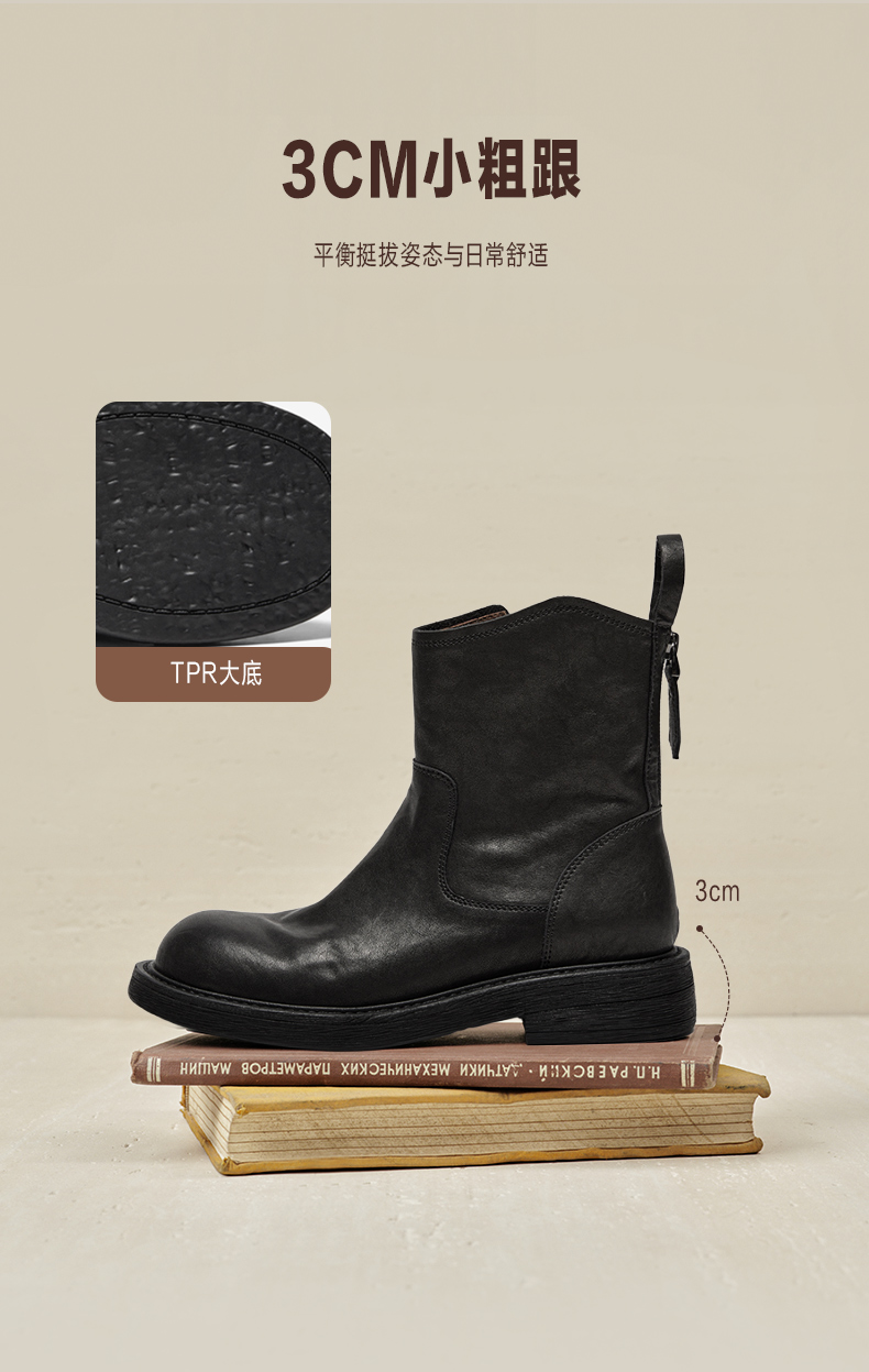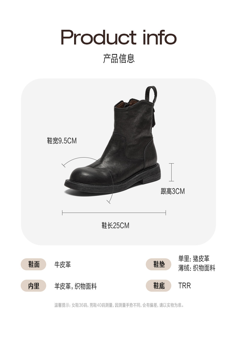 | 鞋底材质:TPR | 靴筒内里材质:织物面料羊皮革 | 内增高:无 | 鞋面材质:牛皮革 | 闭合方式:侧拉链 |