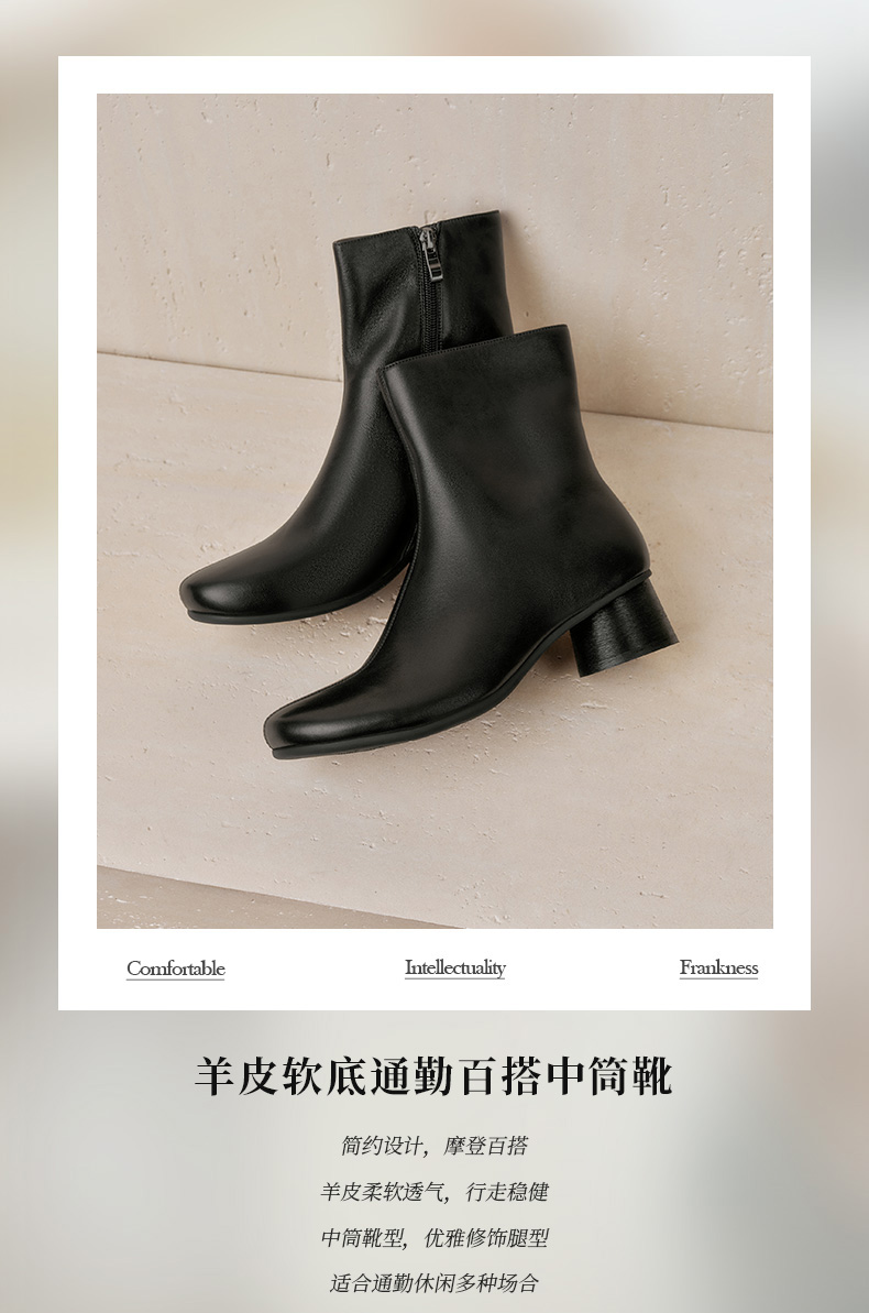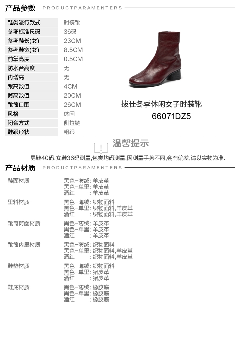 | 鞋底材质:橡胶底 | 靴筒内里材质:羊皮革织物面料 | 内增高:无 | 鞋面材质:羊皮革 | 闭合方式:侧拉链 |