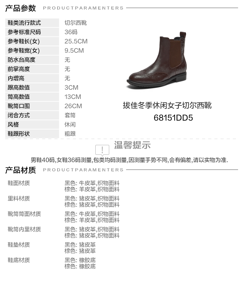 | 筒高数值:13CM | 性别:女子 | 靴筒筒面材质:织物面料羊皮革 | 里料材质:猪皮革织物面料 | 制鞋工艺:胶贴皮鞋 |