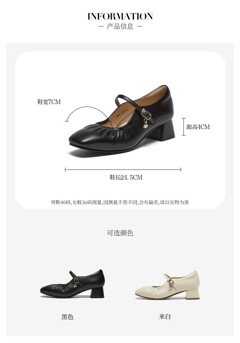 | 鞋面材质:羊皮革 | 流行元素:纯色 | 参考鞋长(女):24.5CM | 参考鞋宽(女):7CM | 闭合方式:一字式扣带 |