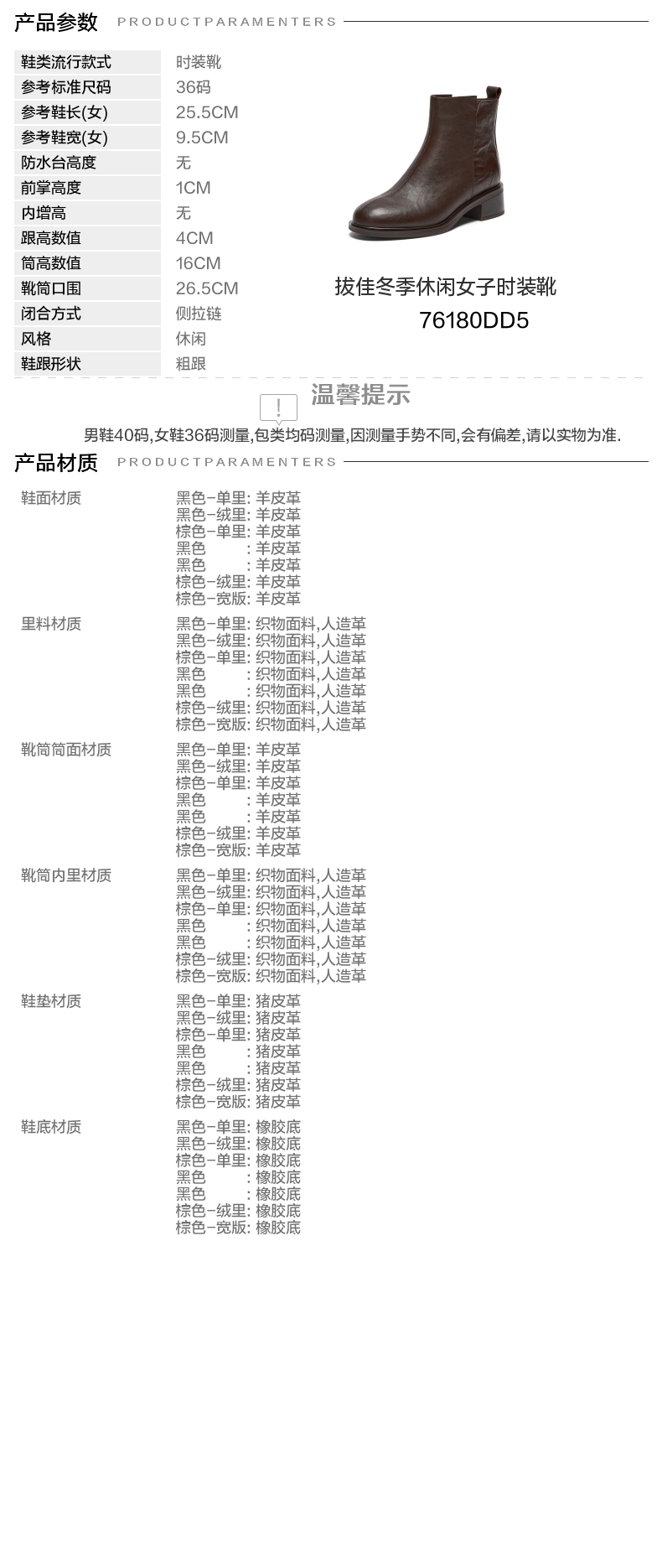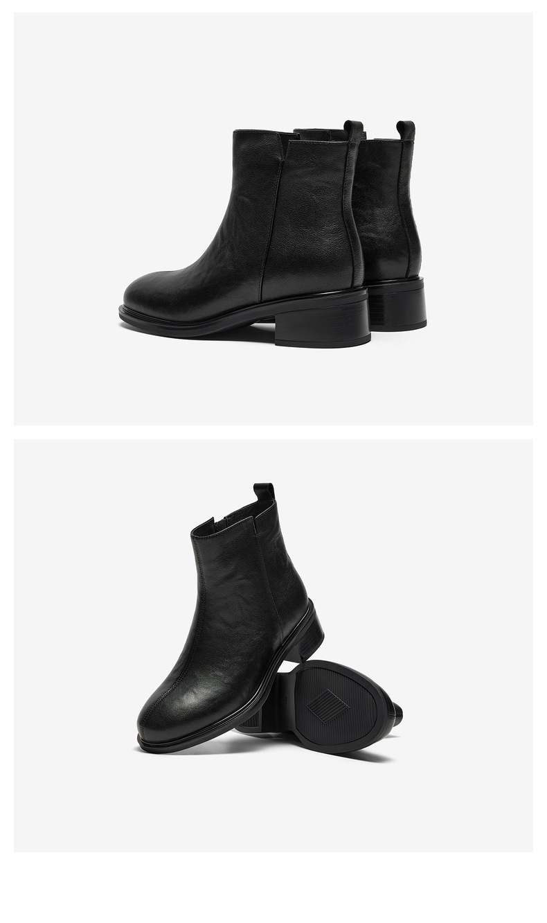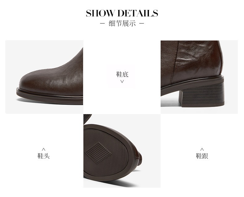 | 鞋底材质:橡胶底 | 靴筒内里材质:织物面料人造革 | 内增高:无 | 鞋面材质:羊皮革 | 闭合方式:侧拉链 |