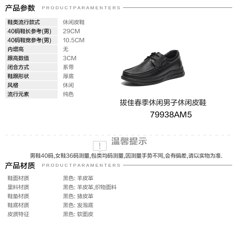 | 40码鞋长参考(男):29CM | 鞋帮:低帮 | 鞋底材质:发泡底 | 内增高:无 | 鞋面材质:羊皮革 |