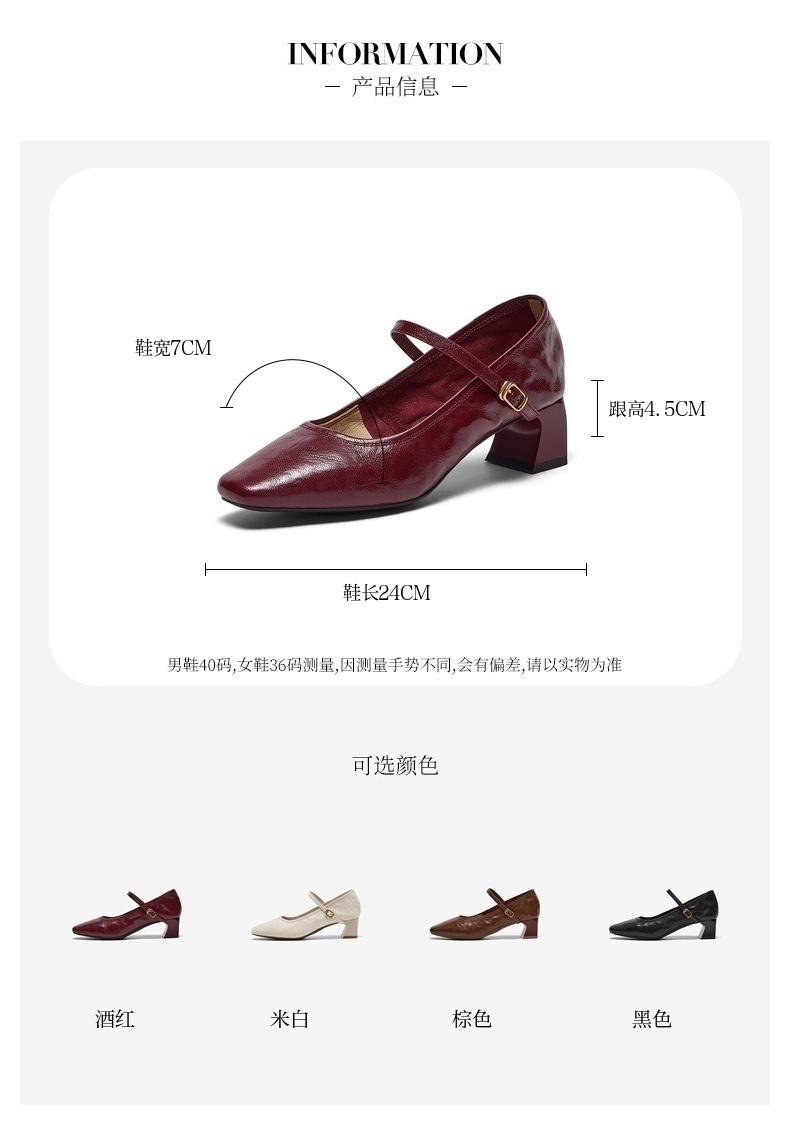 | 鞋面材质:羊皮革 | 流行元素:纯色 | 参考鞋长(女):24CM | 参考鞋宽(女):7CM | 闭合方式:一字式扣带 |