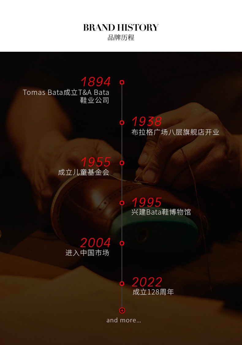 Bata(拔佳),品牌起源于1894年,在捷克的一间手工作坊诞生。品牌理念“我们专注制鞋”,120多年以来,Bata始终秉承百年传统制鞋技术与工艺,致力于为顾客提供舒适的鞋履。