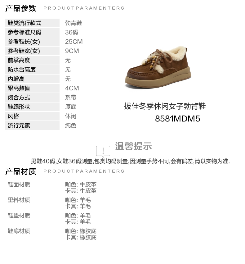 | 色系:咖啡色 | 跟高数值:4CM | 适用人群:通用 | 性别:女子 | 里料材质:羊毛 |