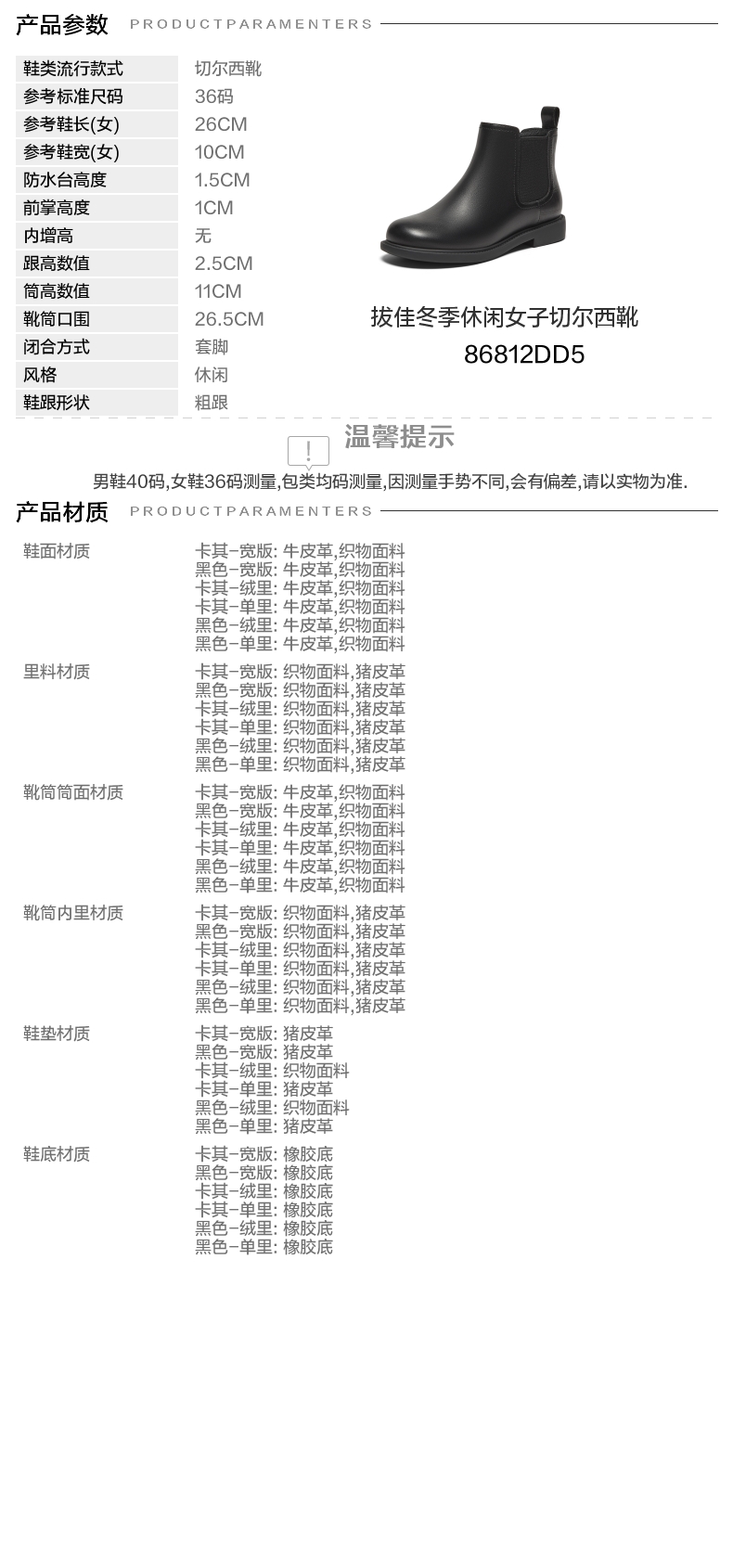 | 帮面材质:牛皮革 | 配跟:无 | 靴筒口围:26.5CM | 上市时间:2025年冬季 | 鞋类流行款式:切尔西靴 |