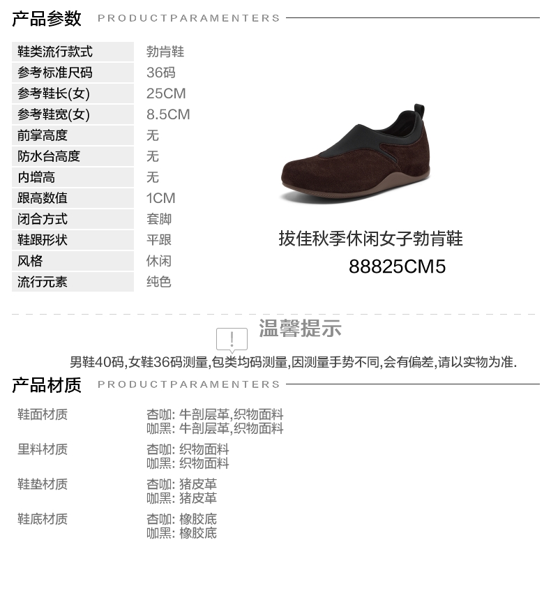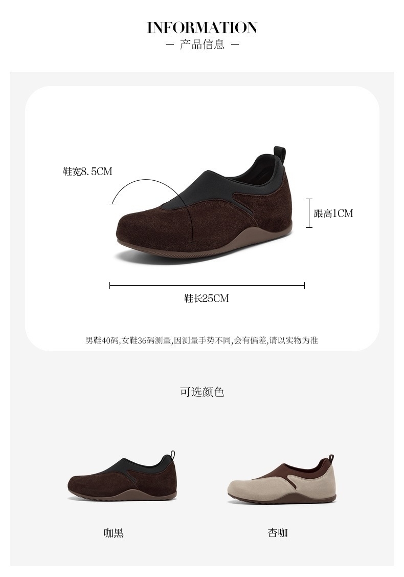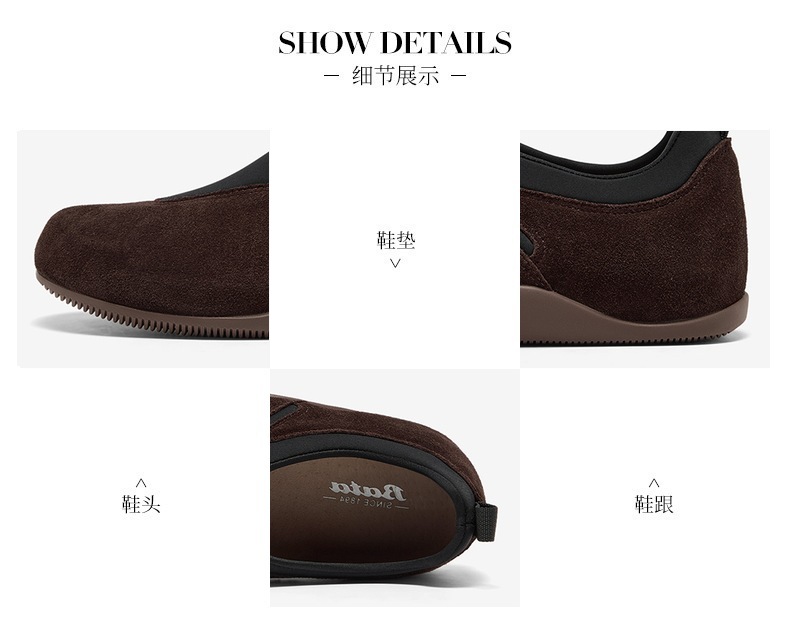 | 鞋帮:低帮 | 鞋底材质:橡胶底 | 内增高:无 | 鞋面材质:牛剖层革织物面料 | 闭合方式:套脚 |