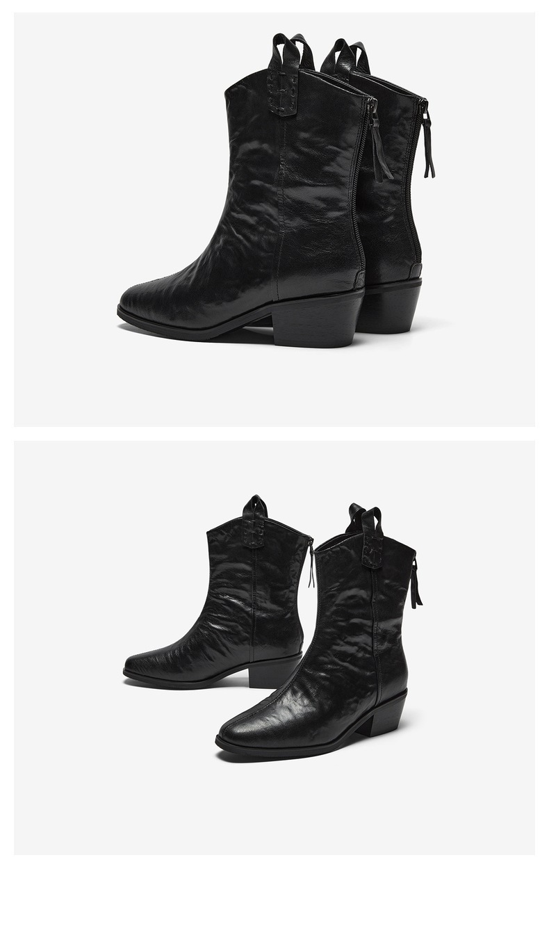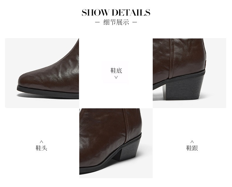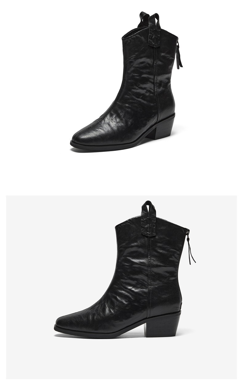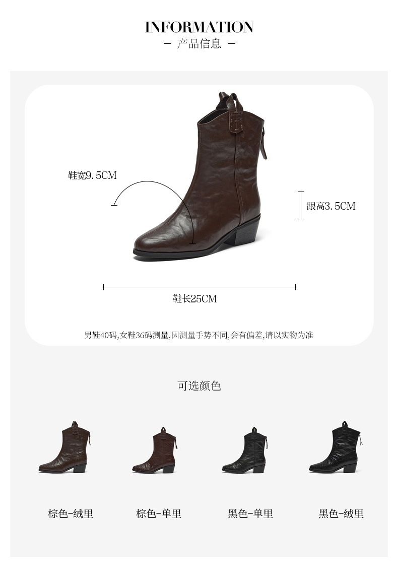 | 鞋底材质:橡胶底 | 靴筒内里材质:猪皮革 | 内增高:无 | 鞋面材质:羊皮革 | 闭合方式:后拉链 |