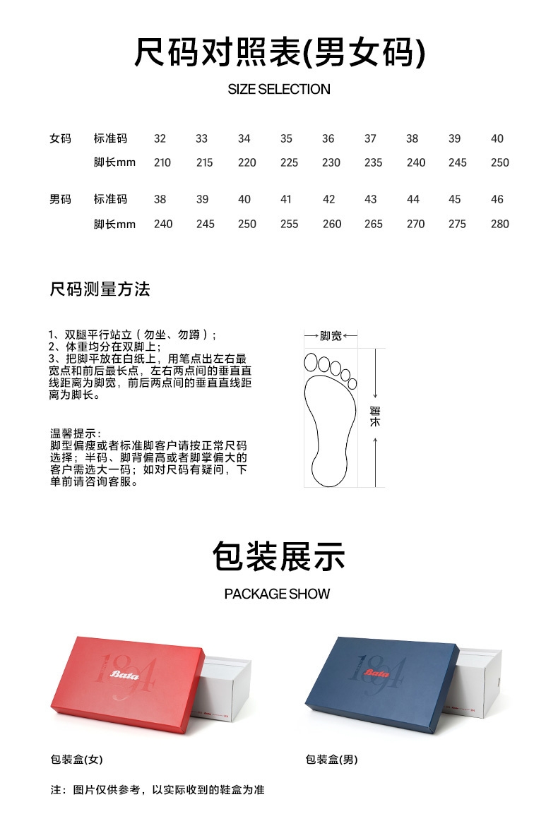Bata(拔佳),品牌起源于1894年,在捷克的一间手工作坊诞生。品牌理念“我们专注制鞋”,120多年以来,Bata始终秉承百年传统制鞋技术与工艺,致力于为顾客提供舒适的鞋履。