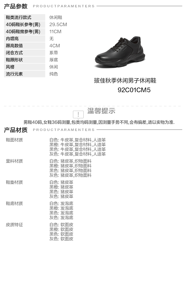 | 风格:休闲 | 色系:黑色 | 跟高数值:4CM | 40码鞋宽参考(男):11CM | 性别:男子 |