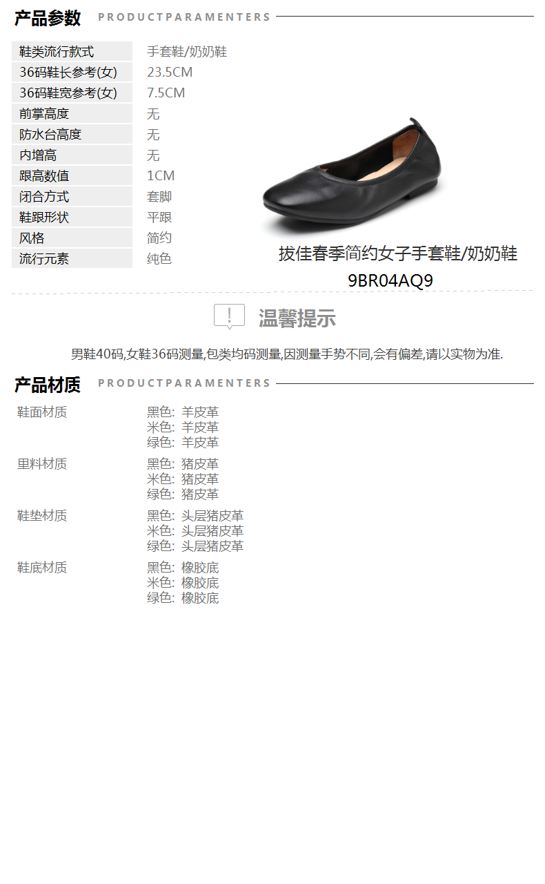 | 前掌高度:无 | 皮质特征:软面皮 | 防水台高度:无 | 销售季:19年春季 |