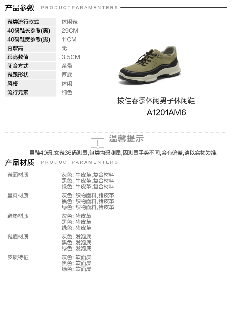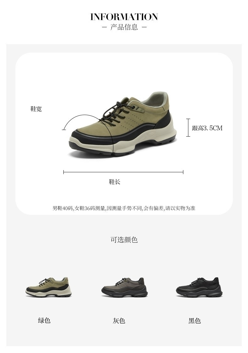 | 风格:休闲 | 色系:绿色 | 跟高数值:3.5CM | 40码鞋宽参考(男):11CM | 性别:男子 |