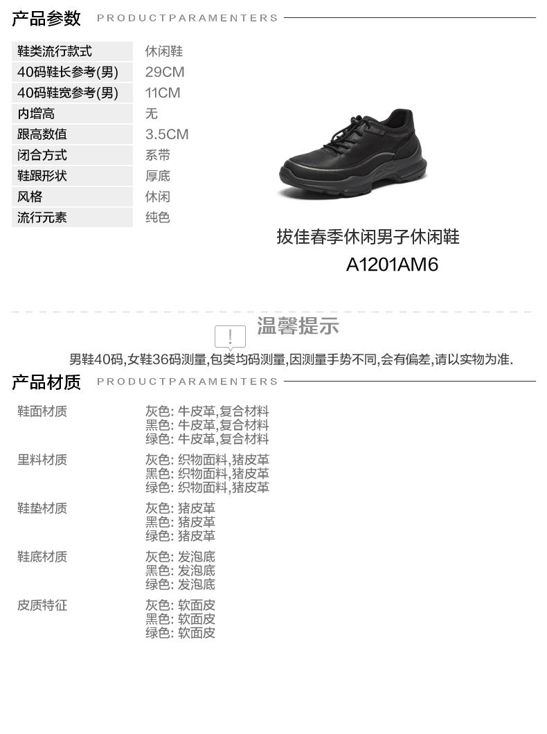 | 风格:休闲 | 色系:黑色 | 跟高数值:3CM | 40码鞋宽参考(男):11CM | 性别:男子 |