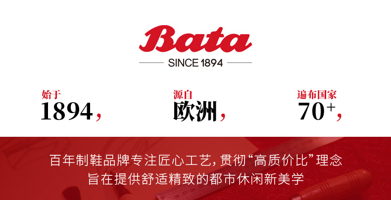 Bata(拔佳),品牌起源于1894年,在捷克的一间手工作坊诞生。品牌理念“我们专注制鞋”,120多年以来,Bata始终秉承百年传统制鞋技术与工艺,致力于为顾客提供舒适的鞋履。