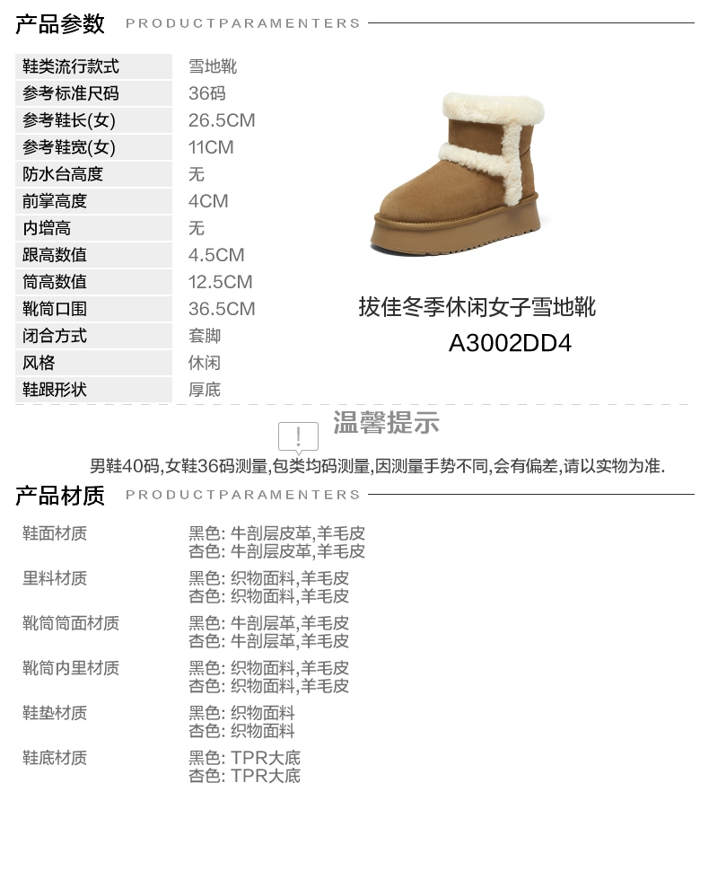 | 鞋底材质:TPR大底 | 靴筒内里材质:羊毛皮织物面料 | 内增高:无 | 鞋面材质:羊毛皮牛剖层皮革 | 适用场合:日常休闲 |