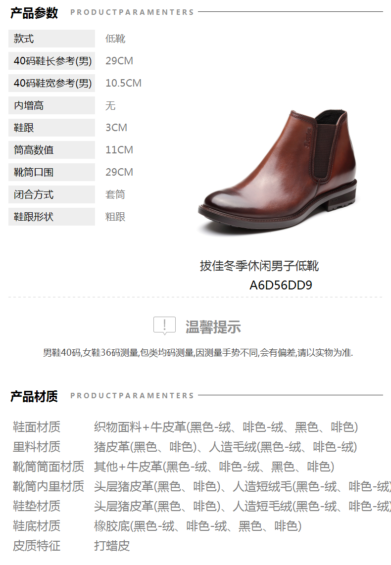 | 40码鞋宽参考(男):10.5CM | 靴筒口围:29CM | 鞋类流行款式:低靴 | 京东热搜词:新款 | 鞋头款式:圆头 |
