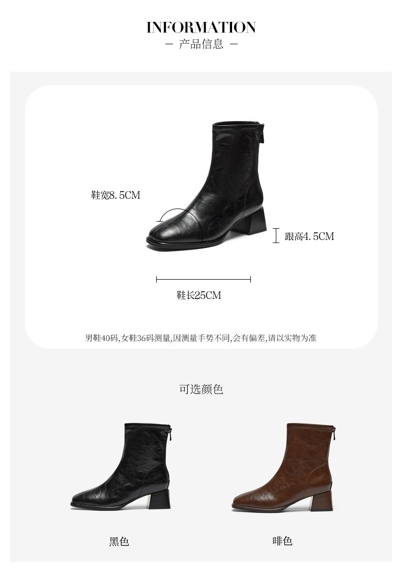 | 鞋底材质:橡胶底 | 靴筒内里材质:人造革织物面料 | 内增高:无 | 鞋面材质:人造革 | 闭合方式:后拉链 |