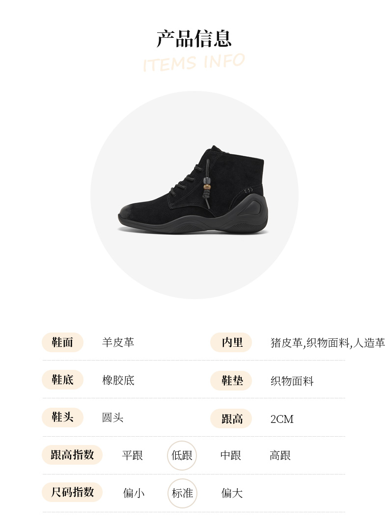 | 鞋底材质:橡胶底 | 靴筒内里材质:人造革织物面料猪皮革 | 内增高:无 | 鞋面材质:羊皮革 | 闭合方式:侧拉链 |
