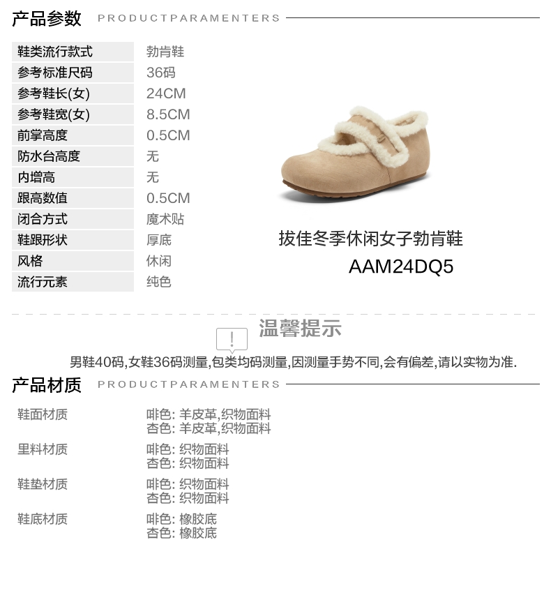 | 鞋垫材质:织物面料 | 款式季节:冬季 | 前掌高度:0.5CM | 皮质特征:软面皮 | 防水台高度:无 |