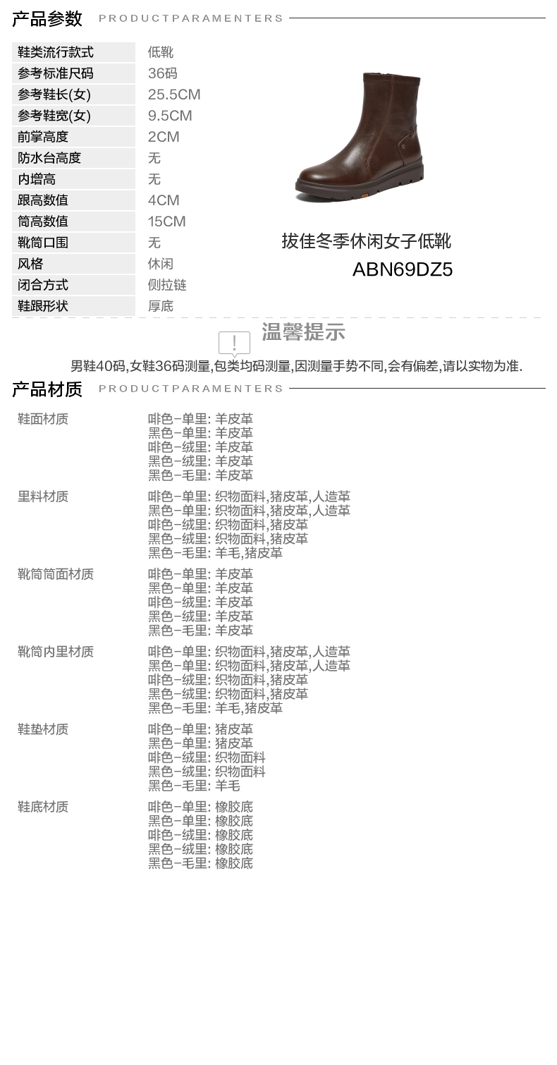 | 鞋底材质:橡胶底 | 靴筒内里材质:织物面料人造革猪皮革 | 内增高:无 | 鞋面材质:羊皮革 | 闭合方式:侧拉链 |