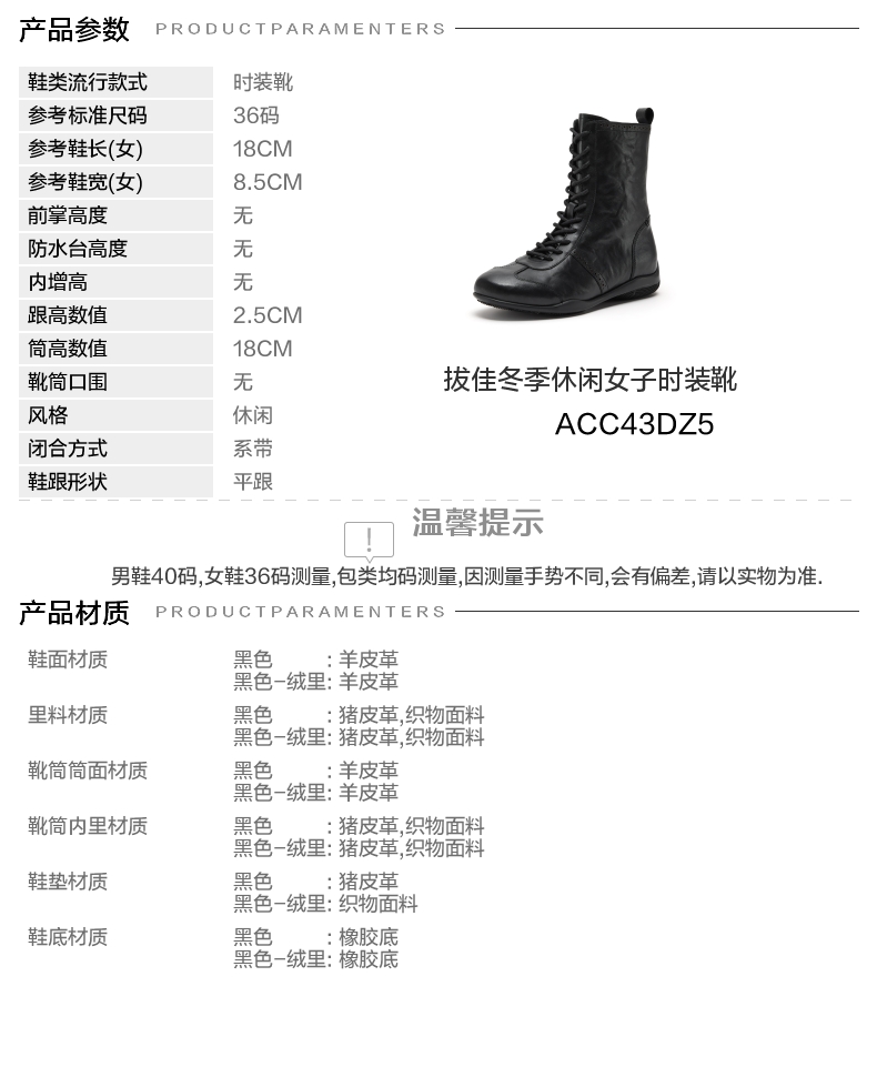 | 靴筒筒面材质:羊皮革 | 里料材质:织物面料猪皮革 | 制鞋工艺:胶贴皮鞋 | 鞋垫材质:猪皮革 | 款式季节:冬季 |