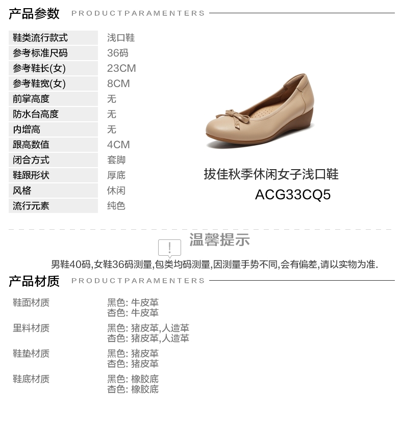 | 色系:浅杏 | 跟高数值:4CM | 性别:女子 | 里料材质:猪皮革人造革 | 制鞋工艺:胶贴皮鞋 |