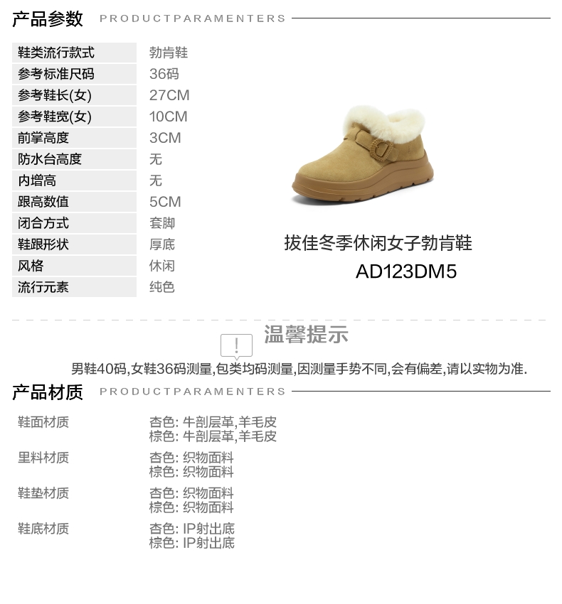 | 鞋帮:低帮 | 鞋底材质:IP射出底 | 内增高:无 | 鞋面材质:羊毛皮牛剖层革 | 闭合方式:套脚 |