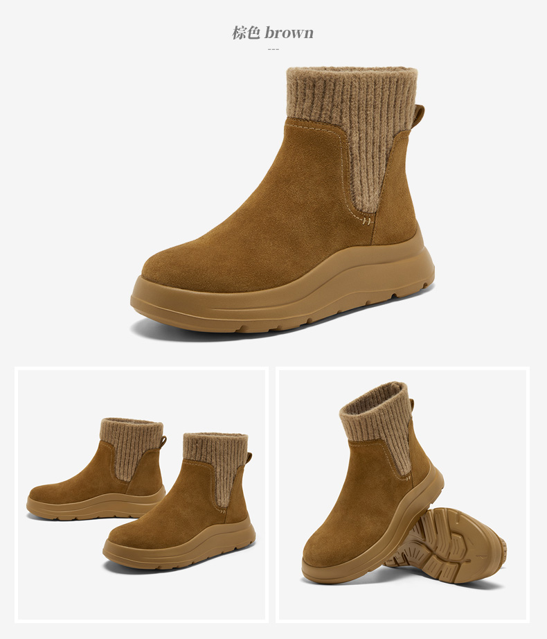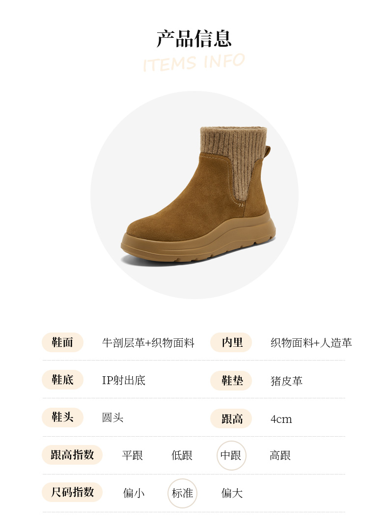 | 鞋底材质:IP射出底 | 靴筒内里材质:人造革织物面料 | 内增高:无 | 鞋面材质:织物面料牛剖层革 | 闭合方式:套筒 |