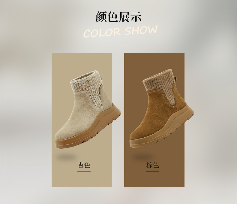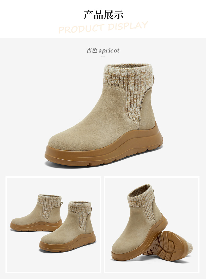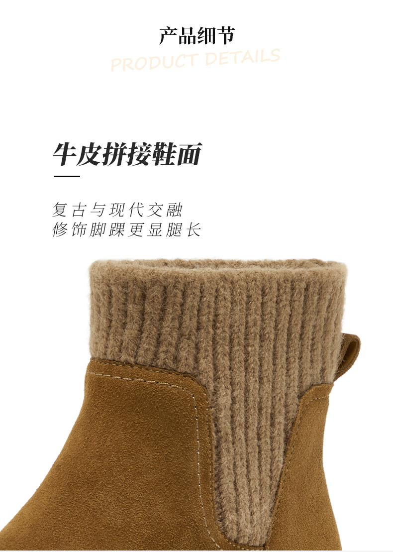 | 帮面材质:牛剖层革织物 | 配跟:无 | 上市时间:2025年冬季 | 鞋类流行款式:弹力靴 | 鞋头款式:圆头 |