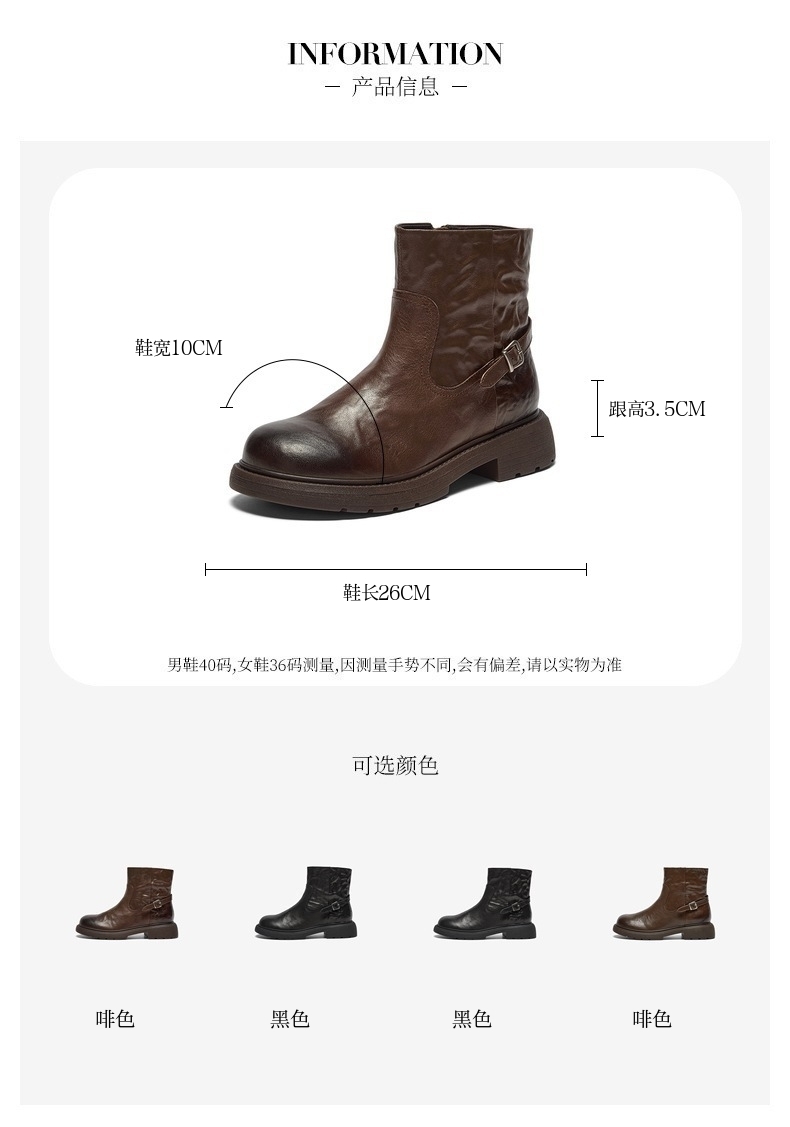| 鞋底材质:橡胶底 | 靴筒内里材质:织物面料猪皮革 | 内增高:无 | 鞋面材质:羊皮革 | 闭合方式:侧拉链 |