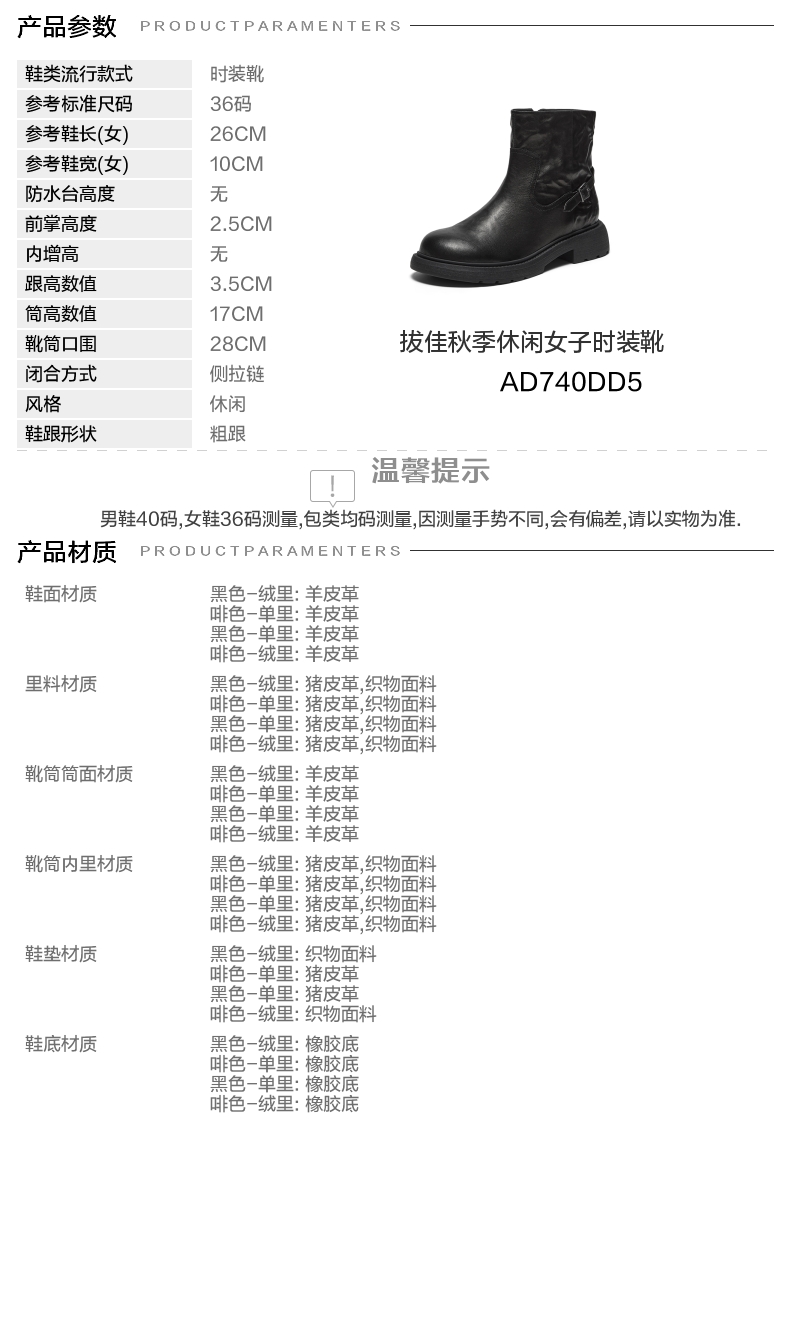 | 鞋底材质:橡胶底 | 靴筒内里材质:织物面料猪皮革 | 内增高:无 | 鞋面材质:羊皮革 | 闭合方式:侧拉链 |