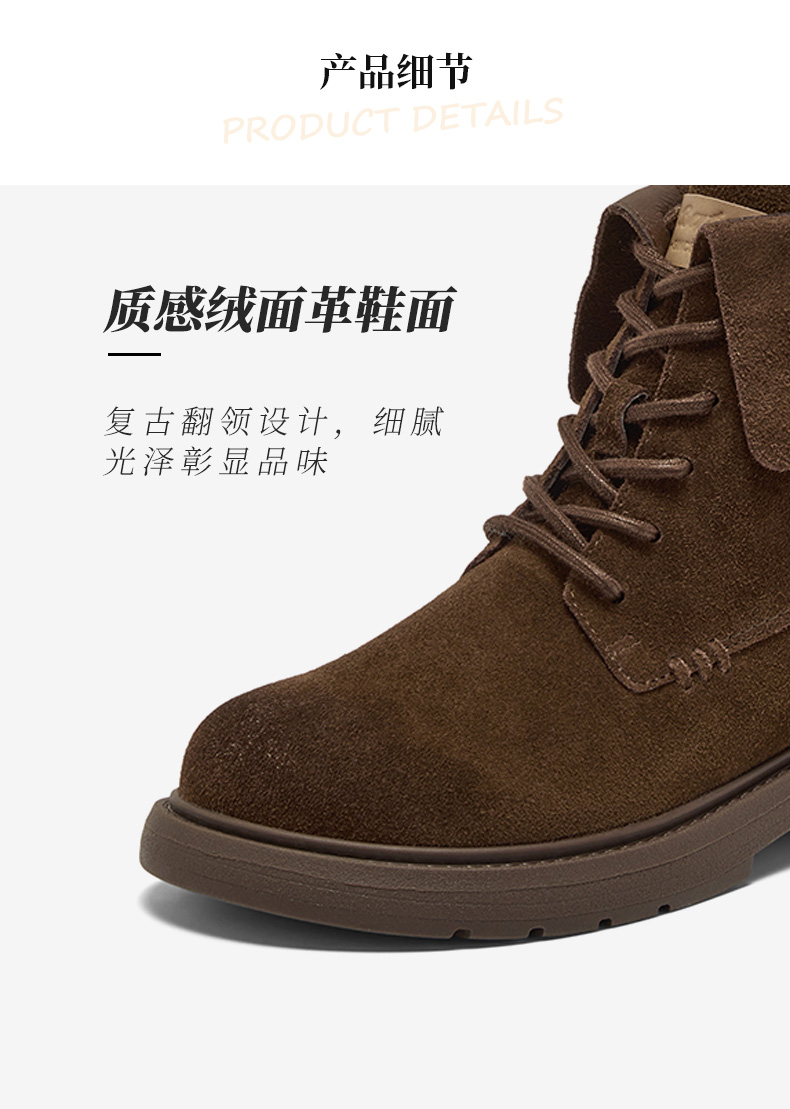| 鞋底材质:橡胶底 | 靴筒内里材质:织物面料 | 内增高:无 | 鞋面材质:牛剖层革 | 闭合方式:系带 |
