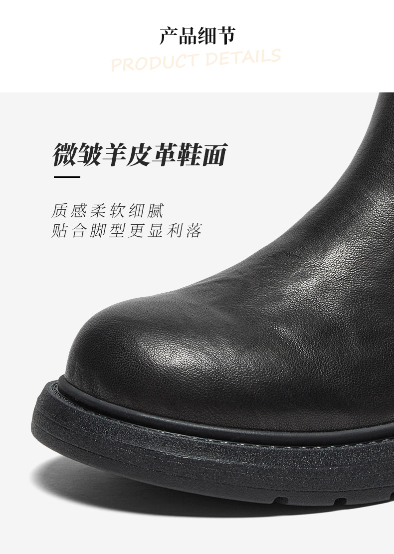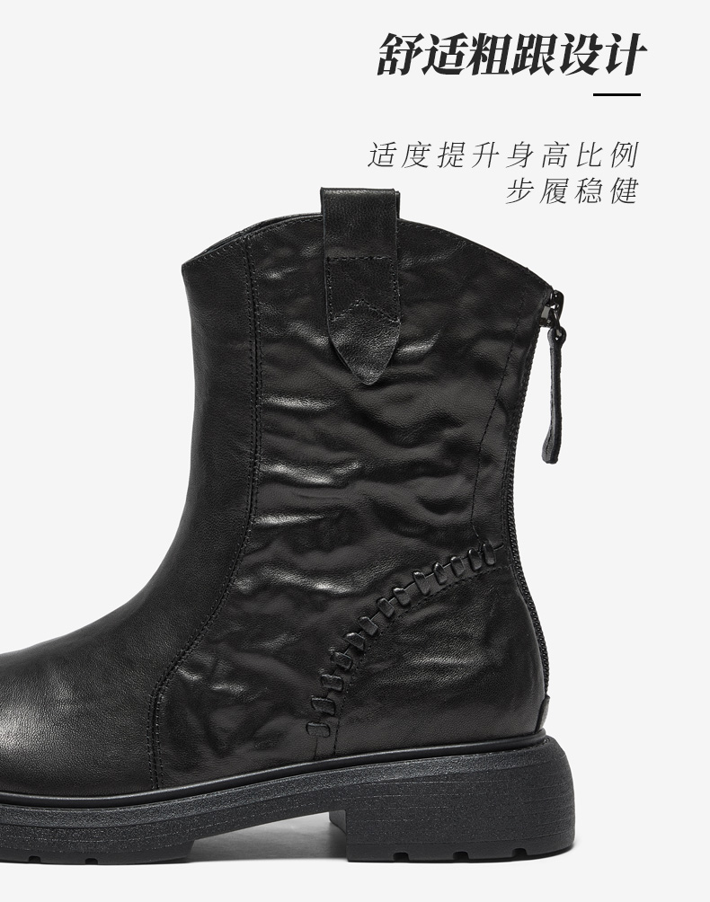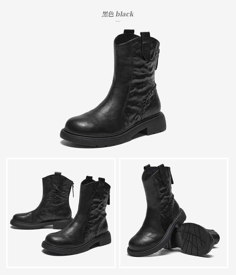 | 鞋底材质:橡胶底 | 靴筒内里材质:织物面料猪皮革 | 内增高:无 | 鞋面材质:羊皮革 | 闭合方式:后拉链 |