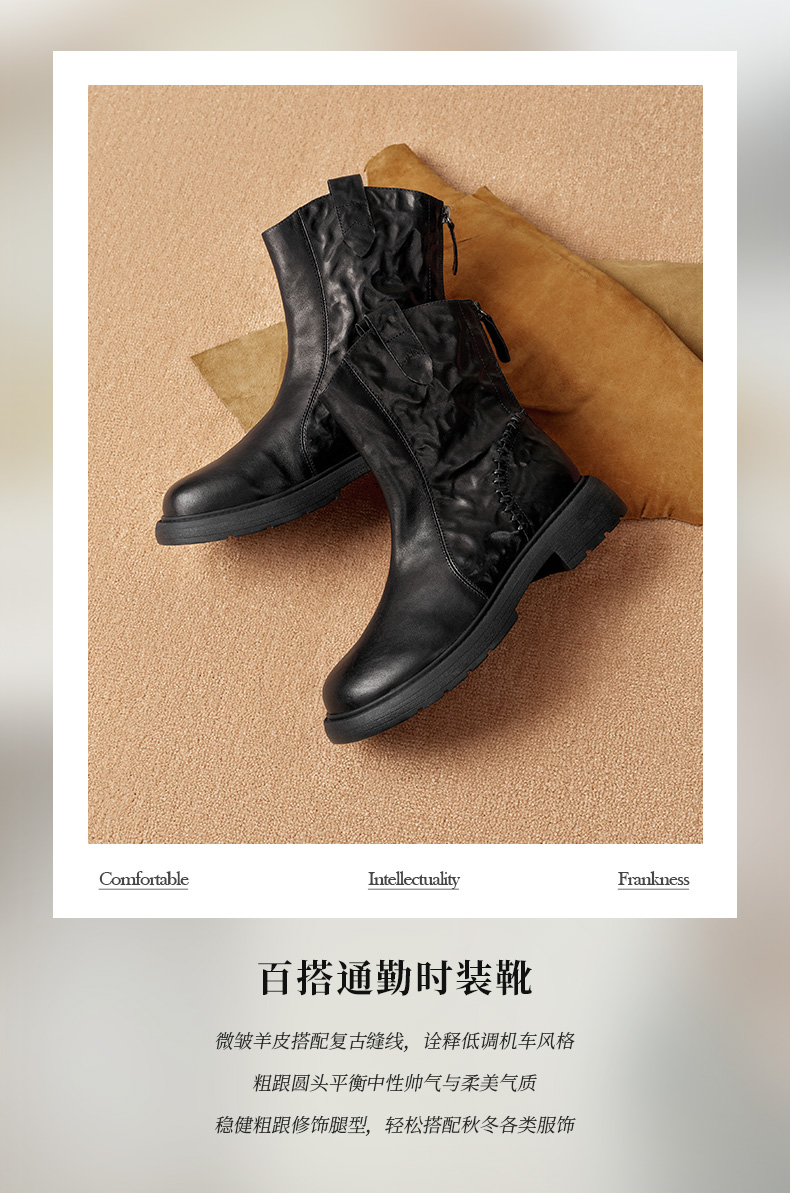 | 鞋底材质:橡胶底 | 靴筒内里材质:人造革织物面料猪皮革 | 内增高:无 | 鞋面材质:羊皮革 | 闭合方式:后拉链 |