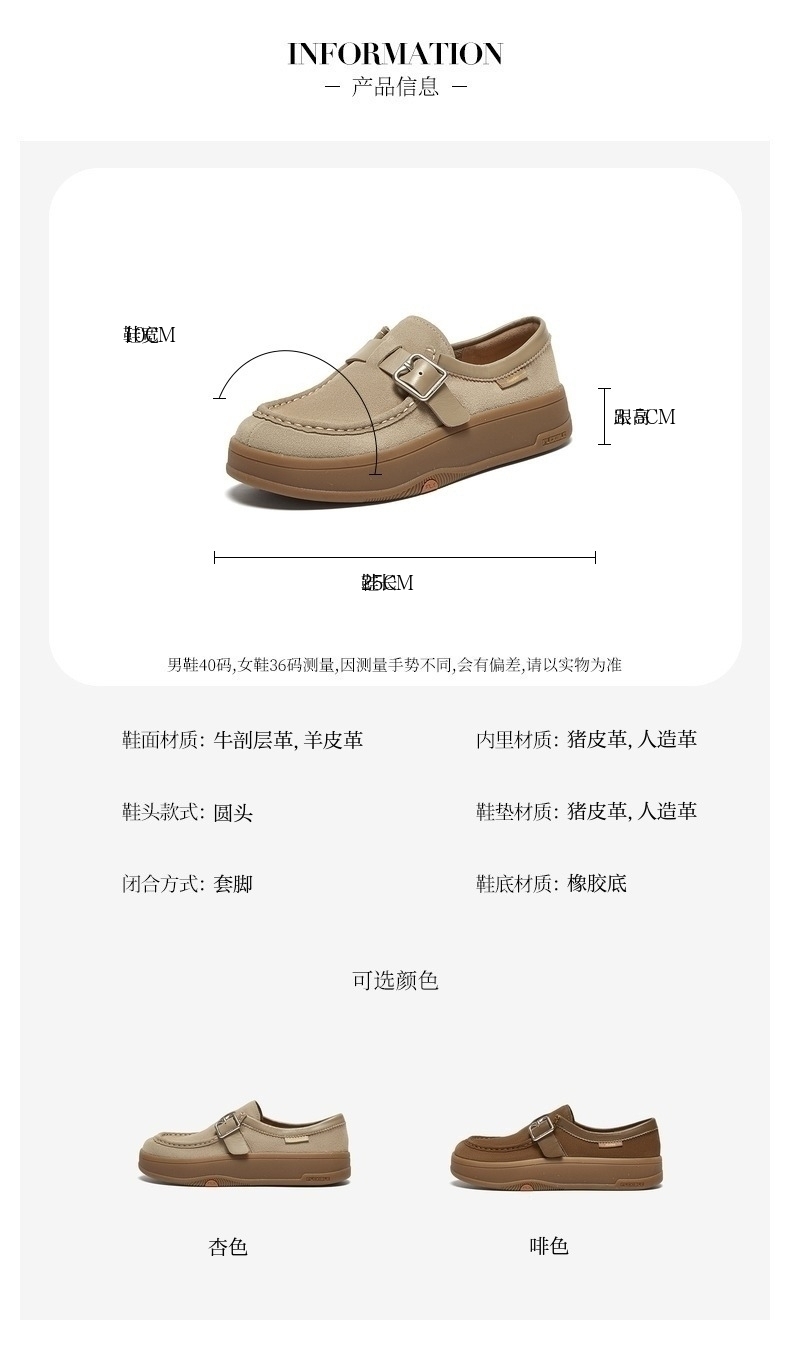 | 鞋帮:低帮 | 鞋底材质:橡胶底 | 内增高:无 | 鞋面材质:羊皮革牛剖层革 | 适用场合:日常休闲 |