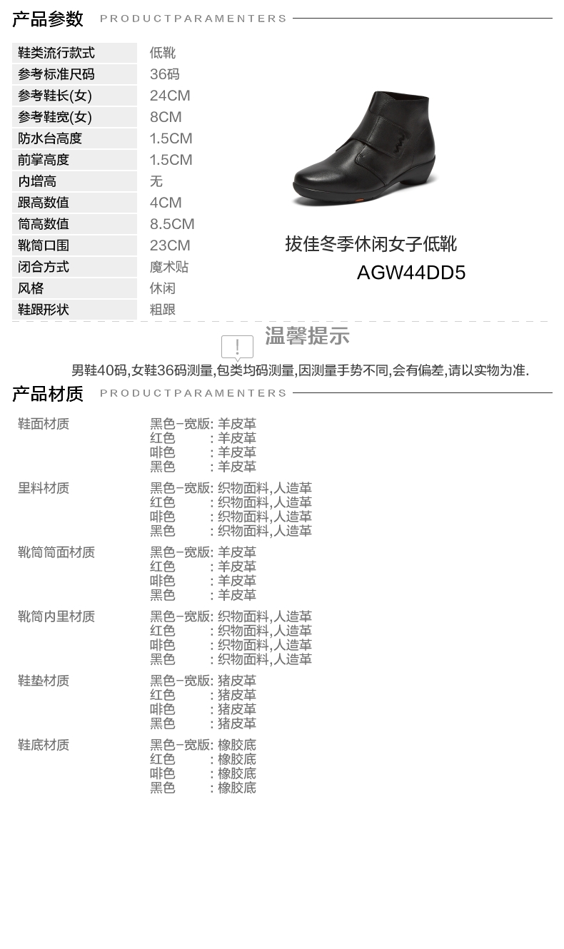 参考鞋宽(女):8CM 风格:休闲 色系:黑色 跟高数值:4CM 筒高数值:8.5CM