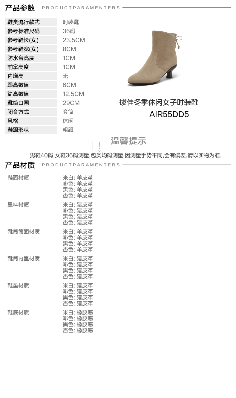 | 筒高数值:12.5CM | 性别:女子 | 靴筒筒面材质:羊皮革 | 里料材质:猪皮革 | 制鞋工艺:胶贴皮鞋 |