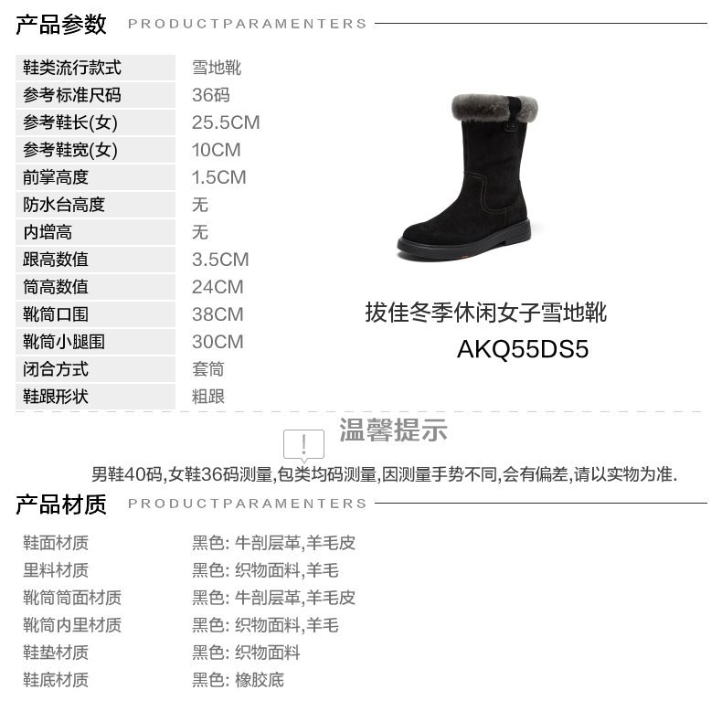 | 靴筒筒面材质:羊毛皮牛剖层革 | 靴筒小腿围:30CM | 里料材质:织物面料羊毛 | 制鞋工艺:胶贴皮鞋 | 鞋垫材质:织物面料 |