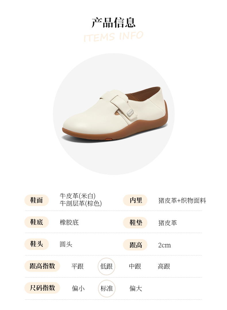 | 闭合方式:套脚 | 风格:休闲 | 跟高数值:2CM | 色系:米白 | 配跟:无 |