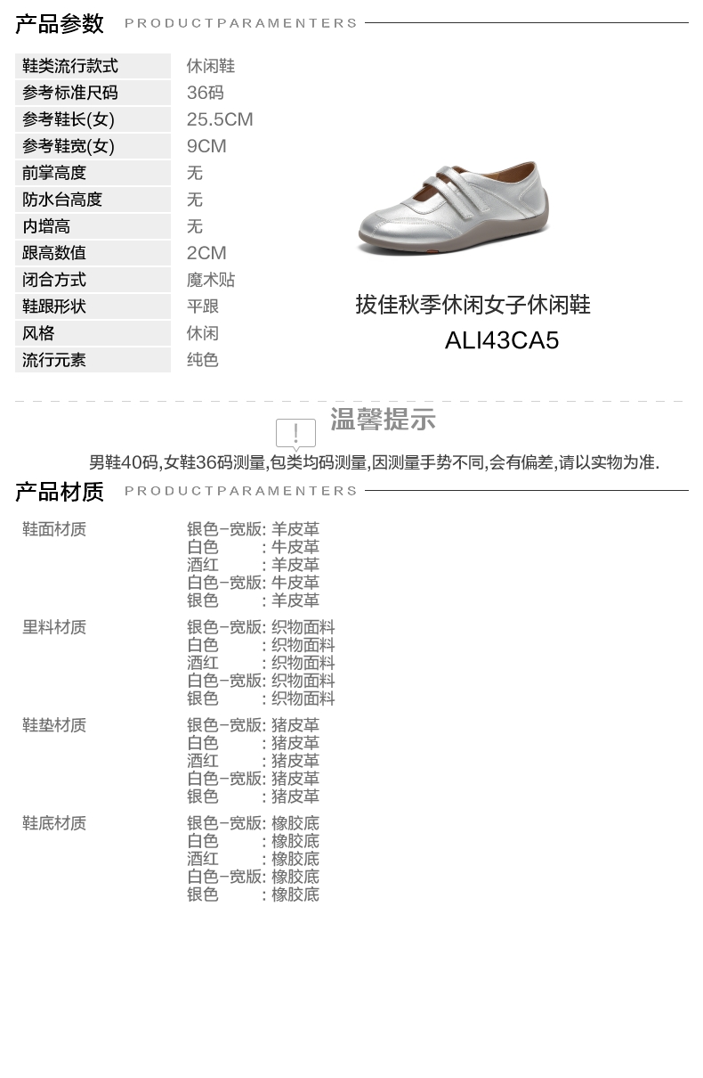 | 鞋帮:低帮 | 鞋底材质:橡胶底 | 内增高:无 | 鞋面材质:羊皮革 | 闭合方式:魔术贴 |