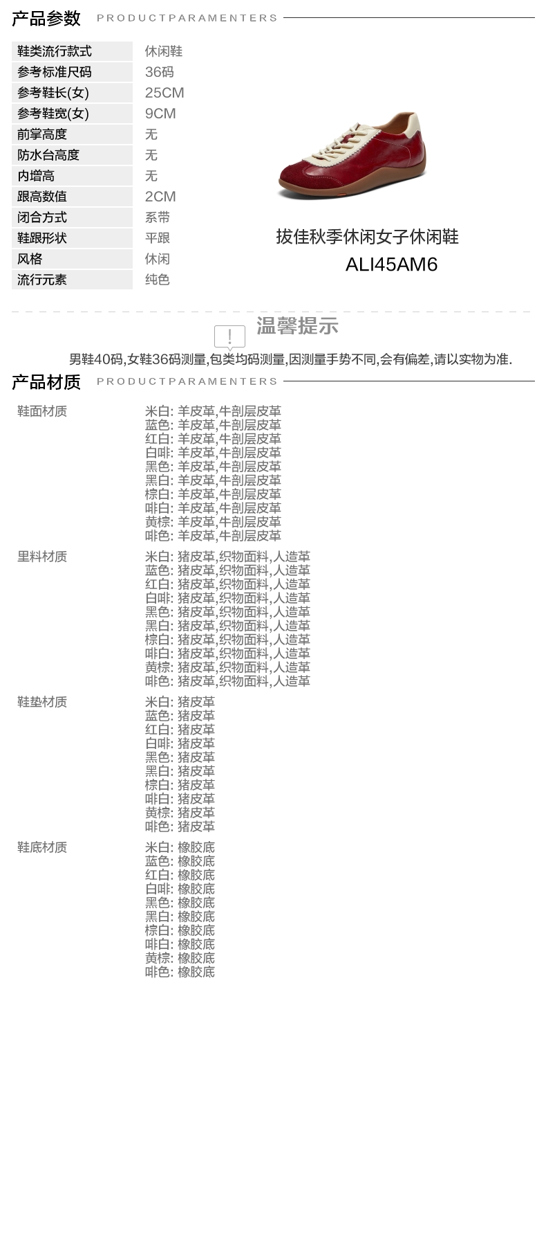 | 鞋帮:低帮 | 鞋底材质:橡胶底 | 内增高:无 | 鞋面材质:牛剖层皮革羊皮革 | 闭合方式:系带 |
